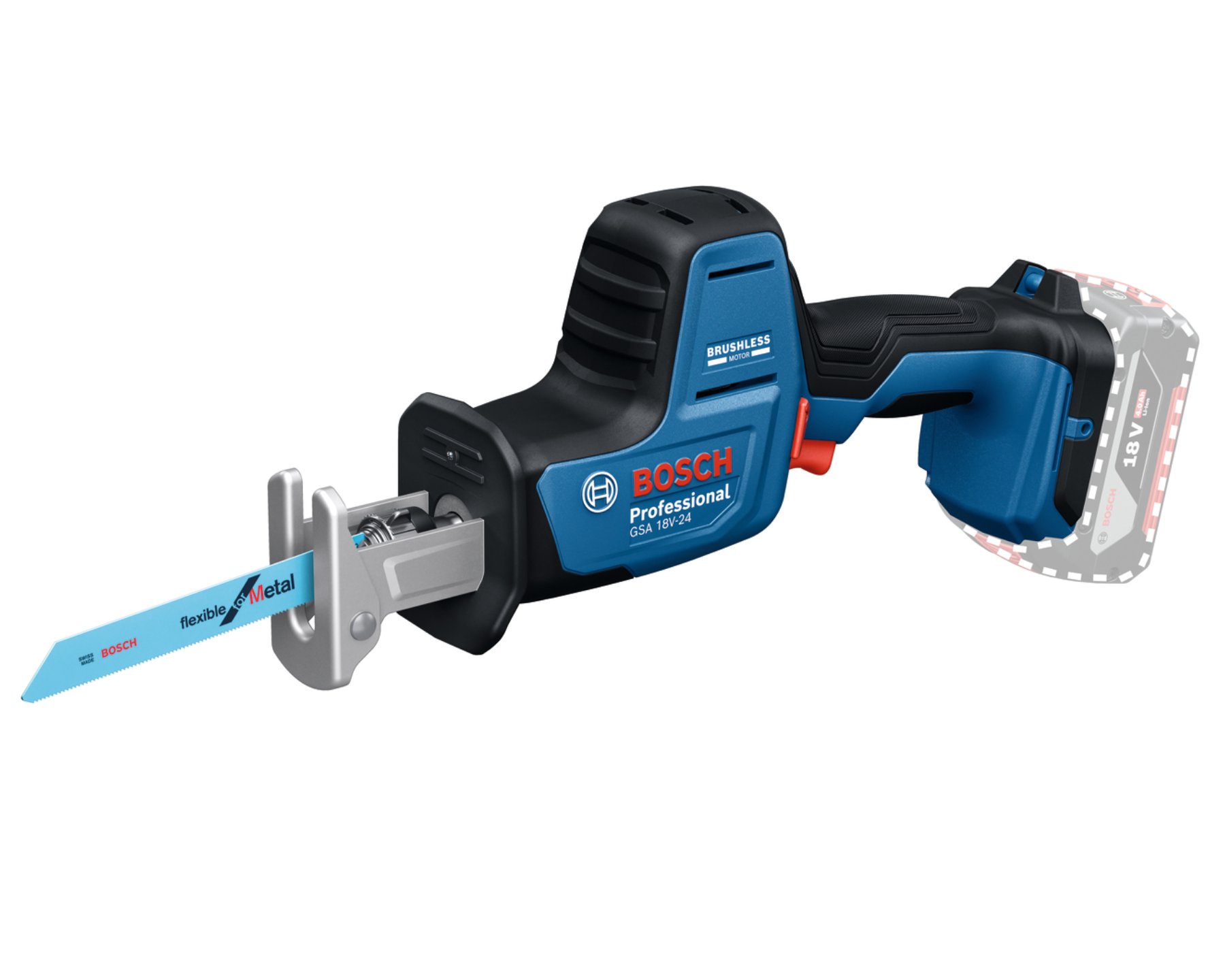 - GSA 18V-24 Professional je vybavena výkonným bezuhlíkovým motorem, plynulou regulací otáček, držákem čepele SDS pro výměnu bez nástrojů, otočnou patkou a LED světlem.