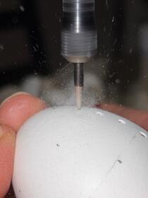 Vajíčko držte pevně, ale s citem. Přibližujte ho k rotujícímu diamantovému hrotu kolmo. Jakmile ucítíte, že se hrot „chytil“, jemně dotlačte. Díky stojanu máte jistotu, že se vám ruka nezachvěje. Pokud chcete větší otvory, použijte kuličkový diamantový nástroj a otvor opatrně rozšiřujte krouživým pohybem.