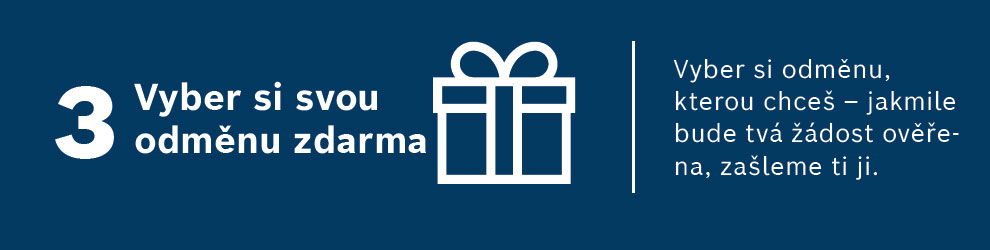 Po ověření nákupu si vyberete odměnu z aktuální nabídky. Bosch vám ji následně zašle zcela zdarma až domů nebo do firmy. Odkaz na aktuální nabídku odměn Bosch