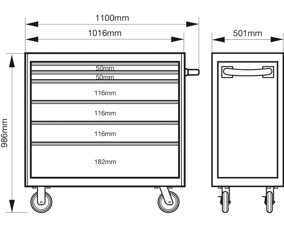 Robustní Heavy Duty konstrukce: Dílenský vozík s rozměry 986 mm x 501 mm x 1100 mm (výška, šířka, délka) je navržen pro nejtvrdší podmínky.