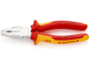 Pochromované kombinované kleště. Rukojeti izolované vícesložkovými návleky, certifikace VDE pro práci pod napětím. Zóny pro uchopení plochého materiálu a materiálu kruhového průřezu, s břity pro měkký, tvrdý a tvrzený pružinový drát.