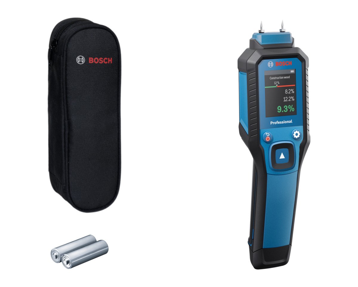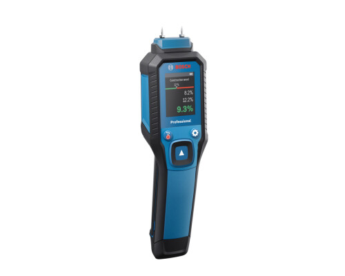 Vlhkoměr materiálu Bosch GMP 1-13 Professional je odolný a přesný přístroj s kolíky, určený pro rychlé a spolehlivé měření vlhkosti ve stavebních materiálech a dřevě. Zvládá měření 37 druhů dřeva a 10 typů stavebních materiálů. Výsledky jsou přehledně zobrazeny na vysoce kontrastním barevném LCD displeji a interpretaci usnadňuje nastavitelná stupnice prahových hodnot. Díky robustnímu pogumovanému pouzdru a krytí IP65 je vlhkoměr připraven na ty nejnáročnější podmínky na staveništi. Spolehlivost zajišťuje průběžný autotest před každým použitím.
