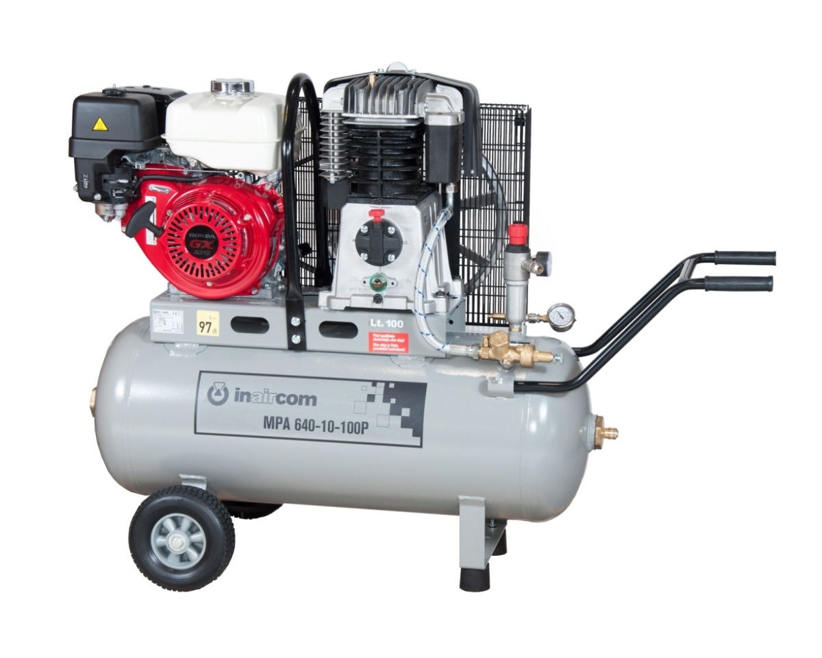 Pojízdný pístový kompresor s benzínovým motorem Honda, maximální tlak 10 bar s plnícím výkonem 515 l/min. a 100l vzdušníkem.