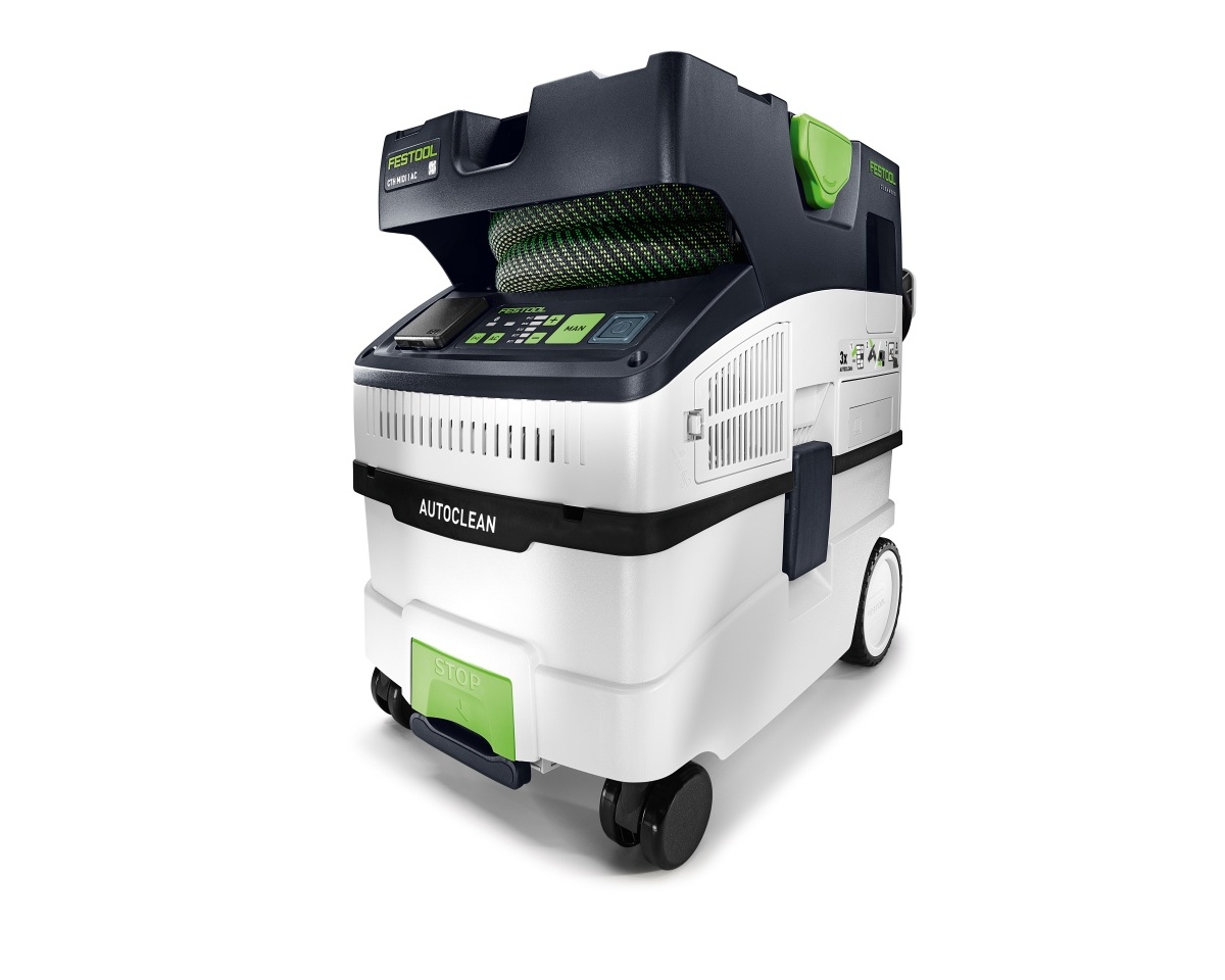 montážní mobilní vysavač Festool CTM MIDI I AC, funkce Bluetooth, příkon 1200W, objem 12,5/15l, hmotnost 11,8kg, automatický oklep AUTOCLEAN, filtrační schopnost třídy H