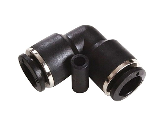 Spojka nástrčného systému pro spojování pevných hadiček (PE,PA,PU) pro automatizaci a další aplikace. Tvar koleno 90°.