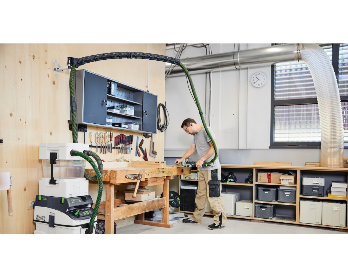 Systémová synergie: Rameno skvěle spolupracuje s dalšími prvky Festool, jako jsou předřazené odlučovače CT-VA nebo rozdělovací ventily, čímž vytváří komplexní systém pro bezprašnou práci.