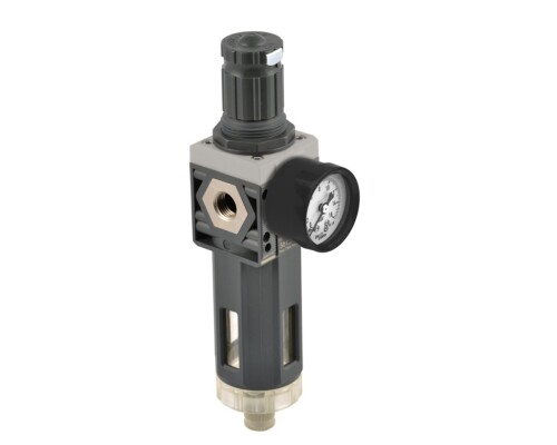 Regulátor tlaku vzduchu s integrovaným filtrem pro redukci tlaku a čištění vzduchu v rozvodech stlačeného vzduchu, přímo na kompresorech nebo před spotřebiči. Plastové provedení.