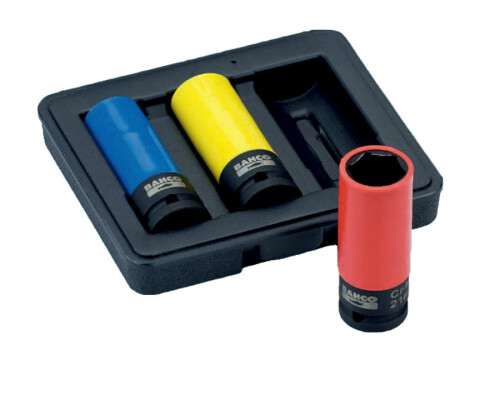 Sada rázových nástrčných klíčů BWSS12P3 obsahuje tři nejčastěji používané velikosti (17, 19, 21 mm) s unašečem 1/2" a délkou 85 mm, ideální pro práci s pneumatickým nebo elektrickým rázovým utahovákem. Klíčovou výhodou je dvojitá plastová ochrana – vnější chrání drahé hliníkové ráfky před poškrábáním a vnitřní chrání matice kol. Hlavice jsou vyrobeny z vysoce pevnostní slitiny oceli s černě fosfátovaným povrchem a jsou barevně odlišeny (modrá, žlutá, červená) pro rychlou a snadnou identifikaci.