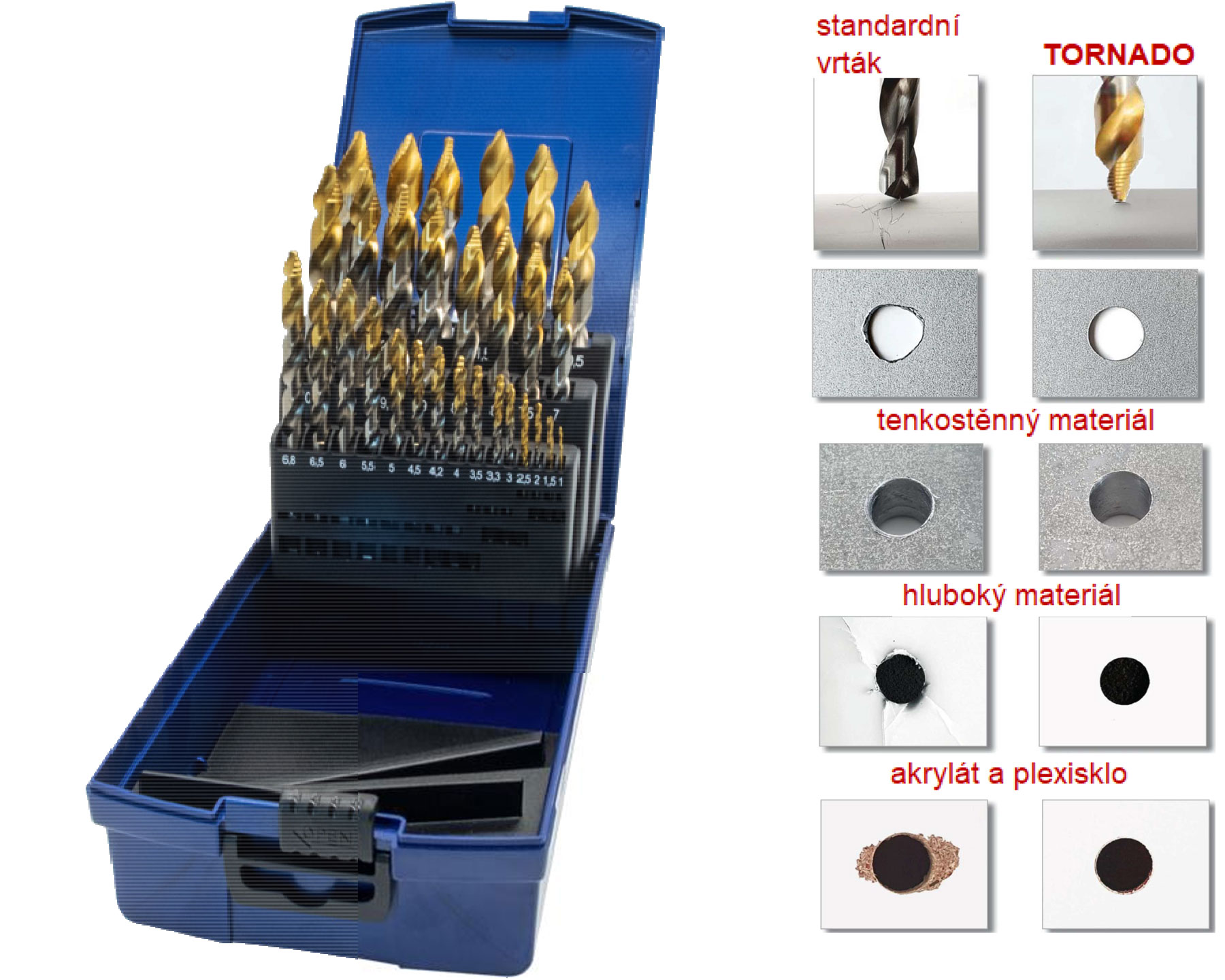 Sada Tornado Drill 29d/1-13TIN je navržena pro ty nejnáročnější aplikace, kde běžné vrtáky selhávají nebo vyžadují příliš mnoho přípravy.