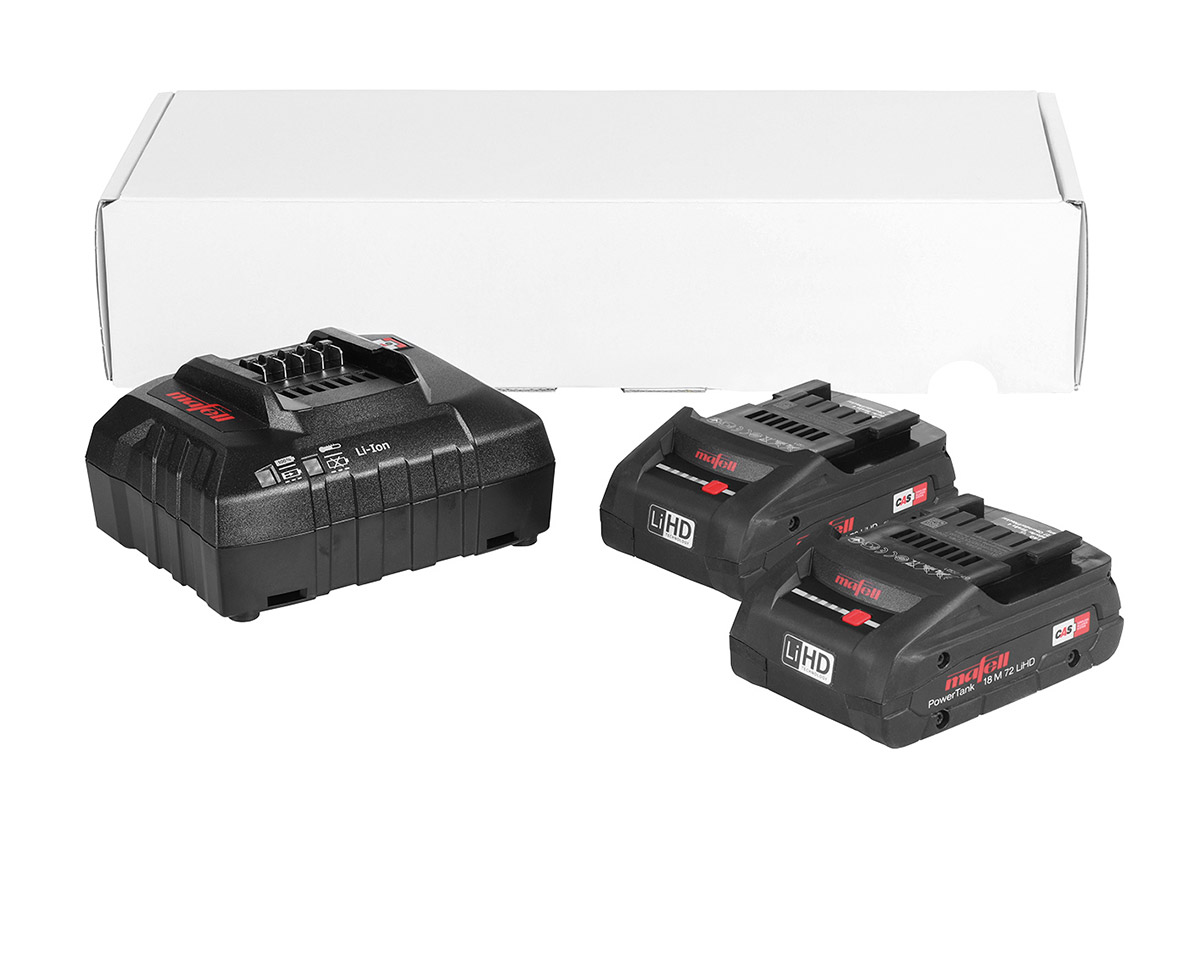 Startovací sada se dvěma kusy akumulátorů Mafell PowerTank 18 M 72 LiHD, napětí 18V, kapacita 4,0Ah, systém CAS a nabíječkou APS M