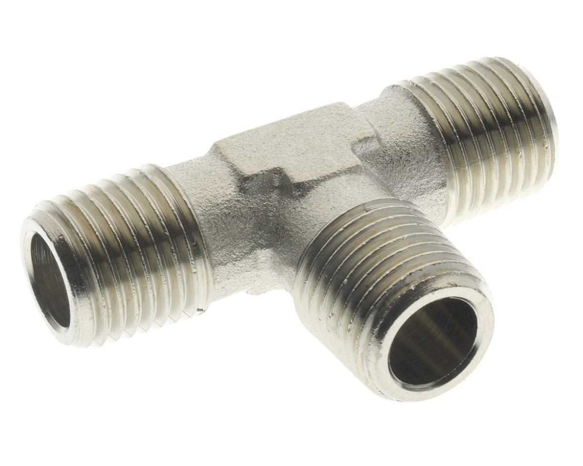 Mosazný rozobočovací T-kus vhodný pro rozvody stlačeného vzduchu i ostatní kapaliny. Niklovaný povrch.