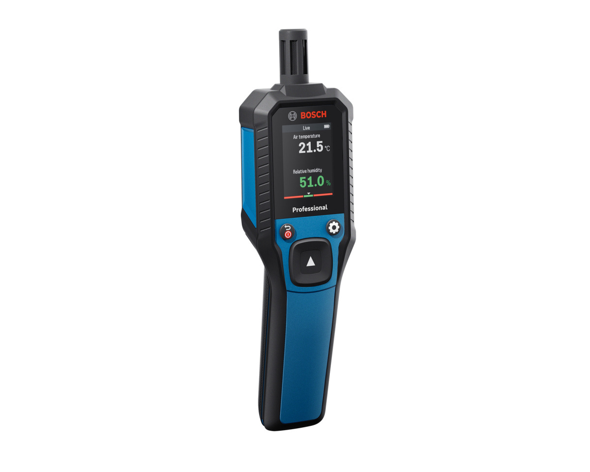 Teploměr a vlhkoměr Bosch GDH 1-17 Professional je odolný přístroj pro přesné monitorování prostředí. Poskytuje v reálném čase klíčové hodnoty, jako je teplota vzduchu, relativní vlhkost, rosný bod, teplota mokrého teploměru a absolutní vlhkost. Vysoce kontrastní barevný LCD displej zaručuje skvělou čitelnost i za špatných podmínek. Díky robustnímu pogumovanému pouzdru a krytí IP65 je ideální pro náročné podmínky na stavbách. Nastavitelná stupnice prahových hodnot navíc usnadňuje rychlou interpretaci výsledků vlhkosti.
