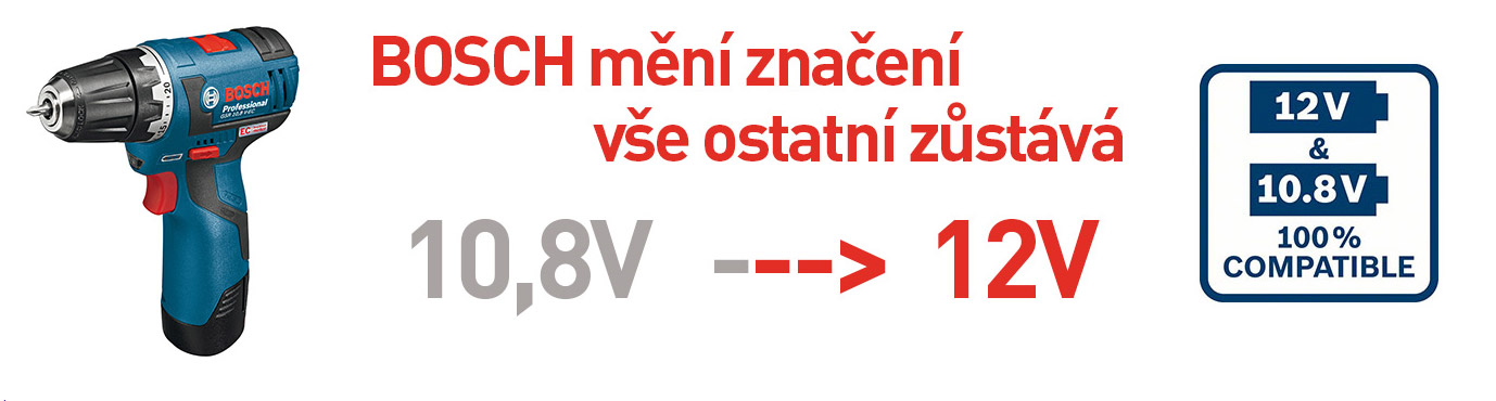 Výrobce nářadí Bosch Professional změní značení akumulátorového nářadí, nabíječek a akumulutárů s napětím 10,8V na 12 V. Proto se kompletní sortiment 10,8V výrobků Bosch Professional od ledna 2017 změní na 12V. Nářadí je stále stejné a je samozřejmě 100% kompatibilní s veškerým současným (10,8 V) a budoucím (12V) elektrickým nářadím, akumulátory a nabíječkami Bosch Professional.